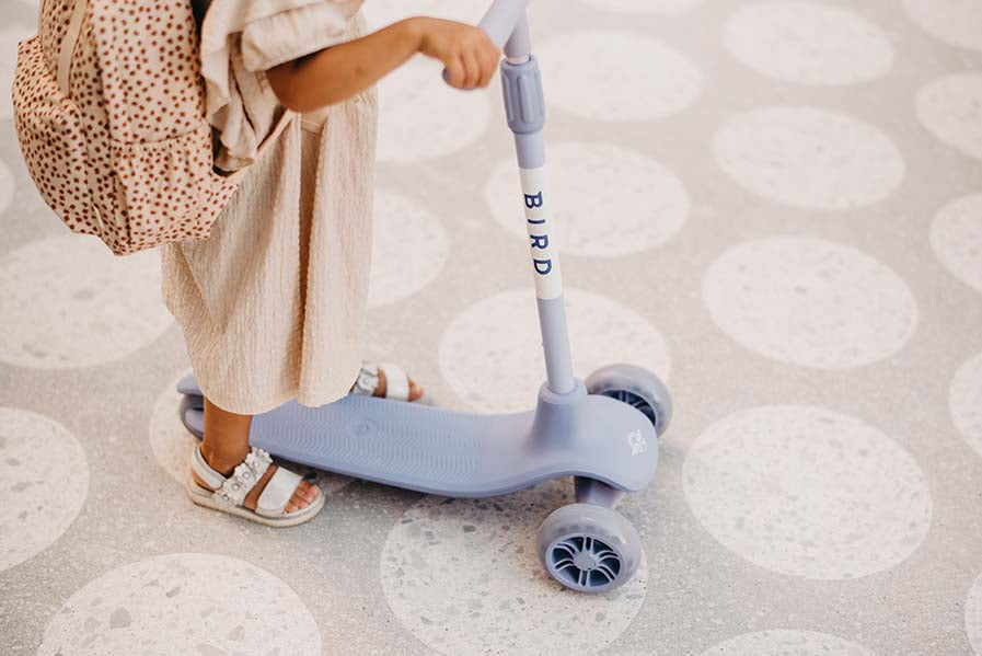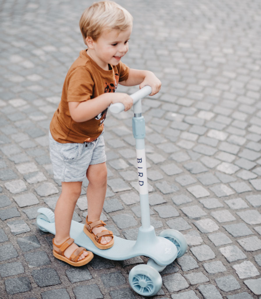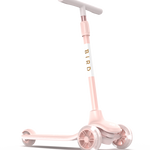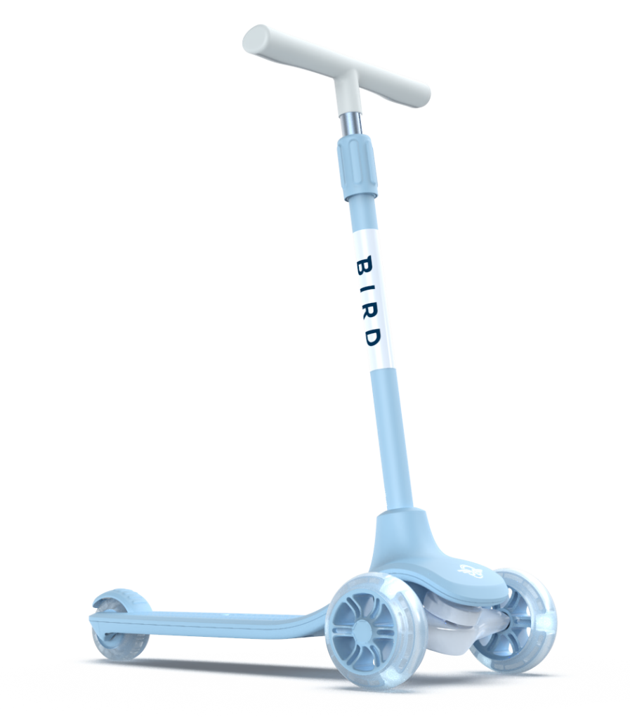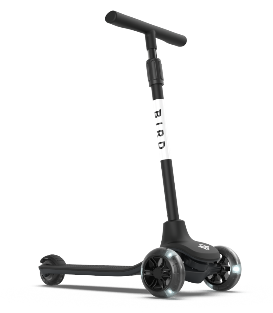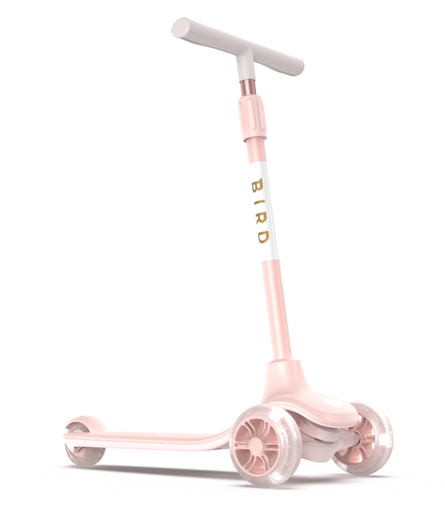 For little ones to ride with style, the new Birdie Glow is the latest Bird kids scooter whose wheels sparkle as it moves. The Birdie Glow is a foot powered non electric scooter for ages 3 and up. Its height-adjustable T-handlebar, "tilt and steer" stem and three-wheel design allow it to fly with large Birds.