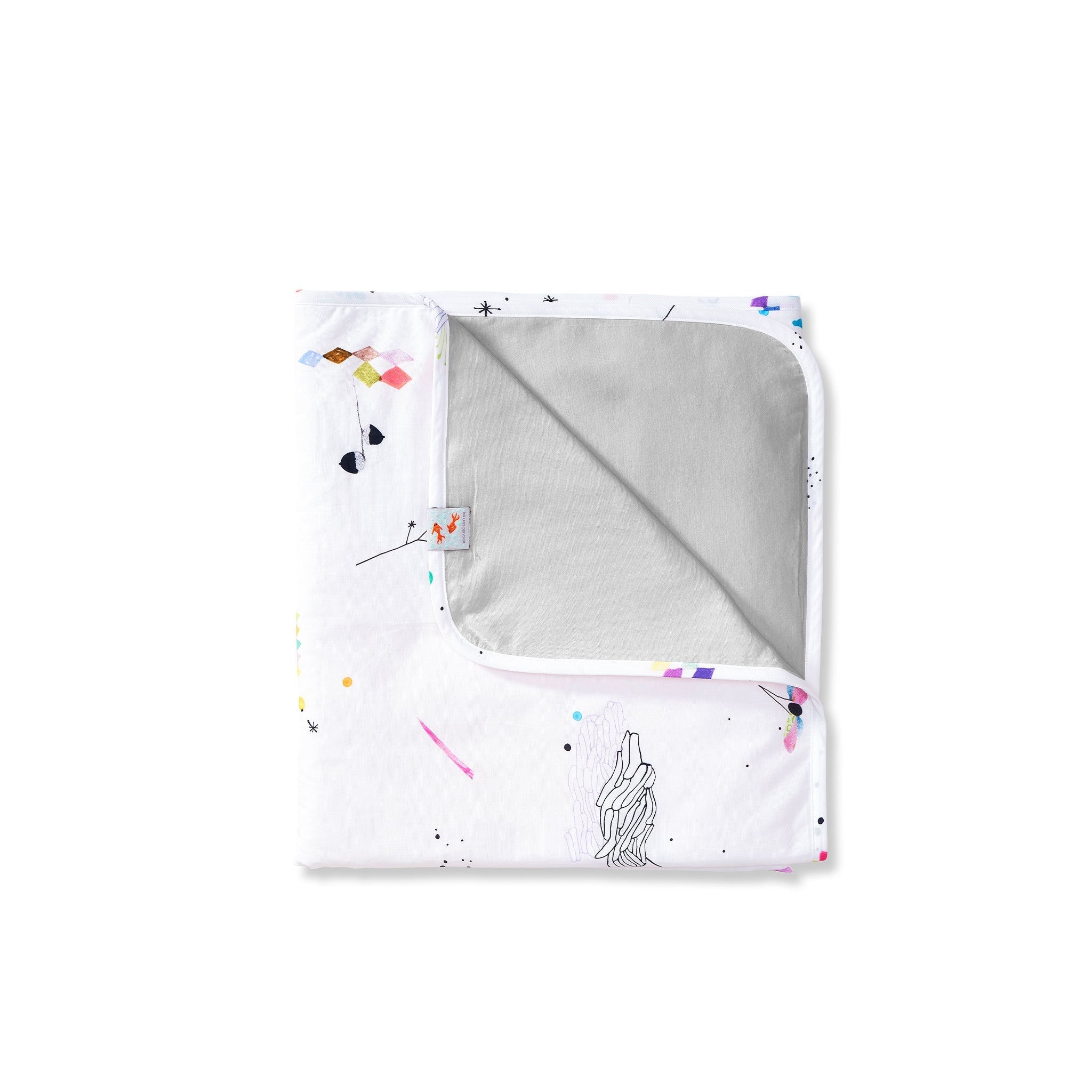 This soft blanket is designed to be used on both sides. The printed side is made of cotton poplin, and the other side is made of super soft combed cotton.