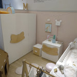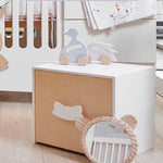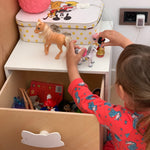 Designed as a mini nightstand on wheels, a table and a toy box that comes out of it. Handle options are available.