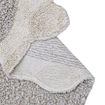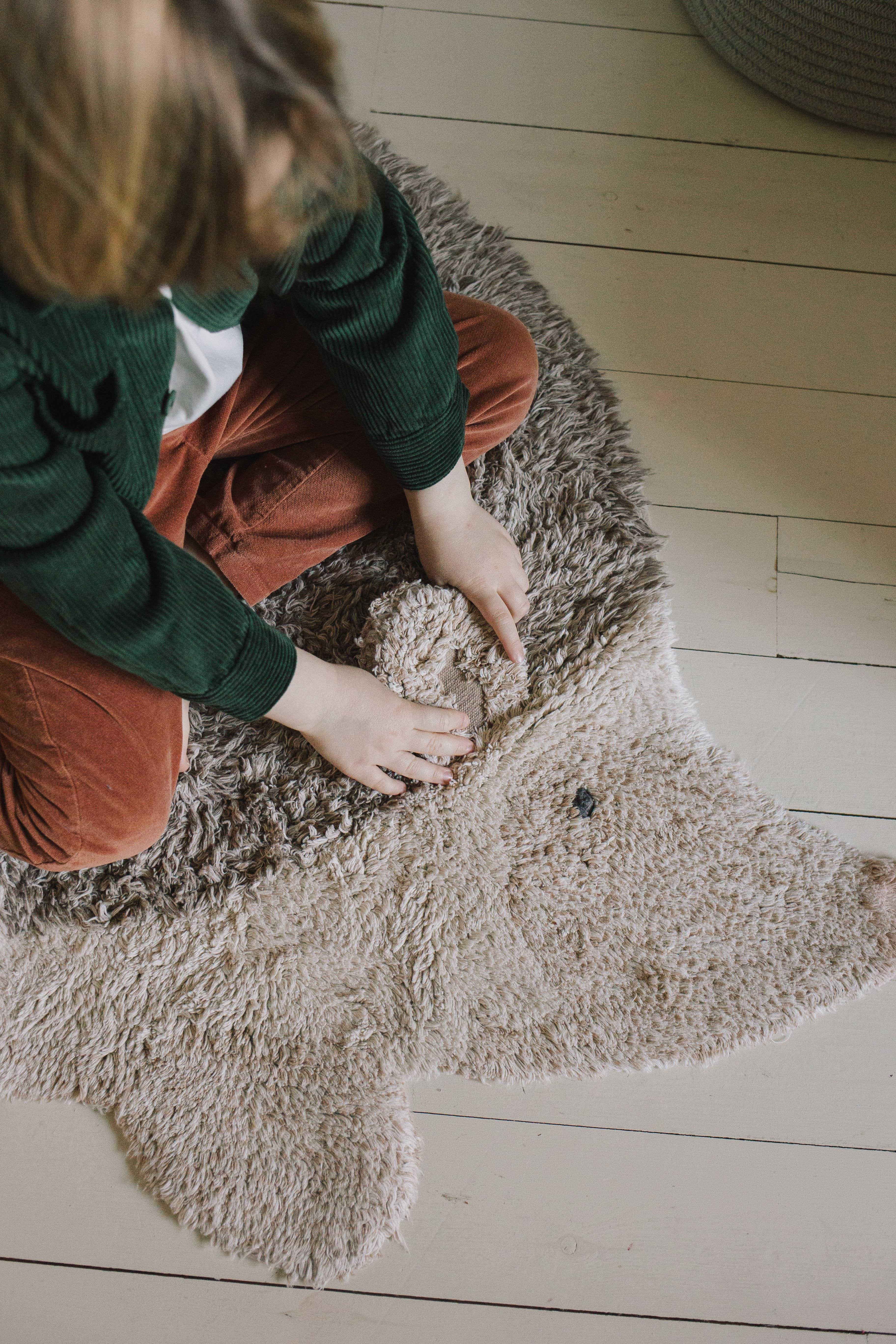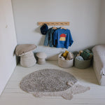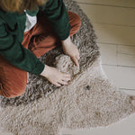 A carefully crafted hedgehog-shaped cotton rug in natural colours and light browns, with a long-pile and fluffy texture that imitates the hedgehog's quills.