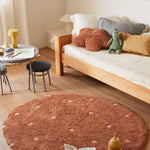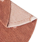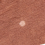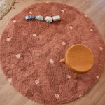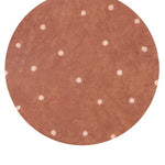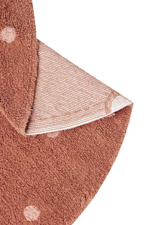 A soft, cotton nursery rug with a dotted design that never goes out of style . Covered in extra-high-density, soft cotton pile, the Round Dot rug is available in three beautiful color combinations: Chestnut with Rose dots, Rose with Natural dots, and Blue Sage with Vintage Blue dots. 97% cotton, 3% other fibers