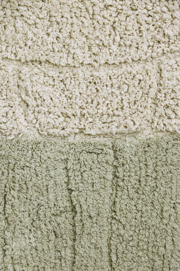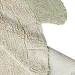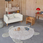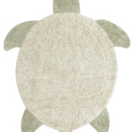 Sea Turtle children's room rug is made of cotton and soft. The rug is tufted with a hexagonal pattern simulating a geometric shell, with high and low piles in natural colors. The head, paws and tail are clustered in short and medium olive green shapes, all together creating the silhouette of a charming sea turtle.