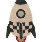 3,2,1..., Explosion! Get ready to enjoy a cosmic journey with Washable Rug Rocket. Handmade rocket-shaped rug in natural and dark grey, obtained from a mixture of dark grey and mosaic green, adding a vintage touch to the design. A round window in blue sage and a tufted fire in light honey, new terracotta and red.