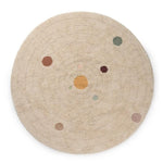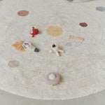 Handcrafted with a natural cotton base and decorated with thin grey lines simulating orbits and planets, this interactive round rug is both decorative and practical.