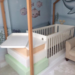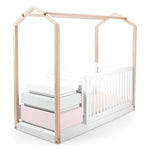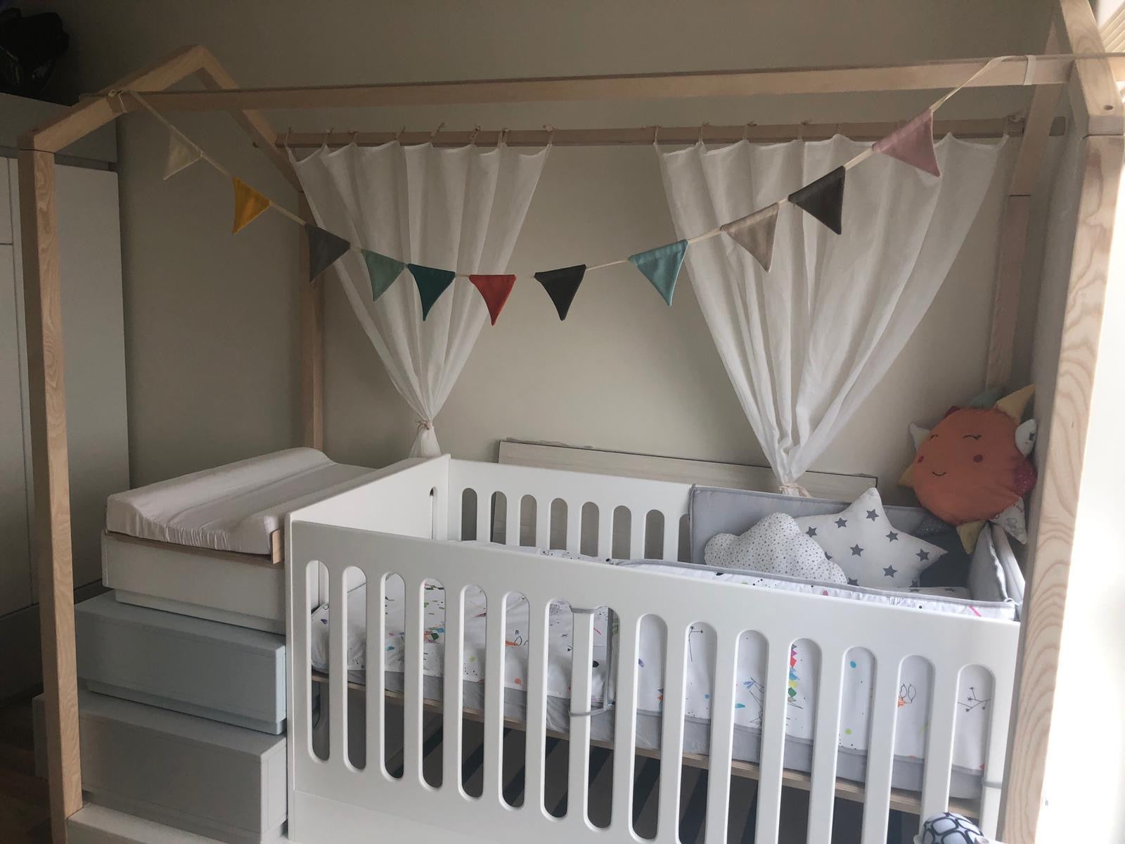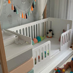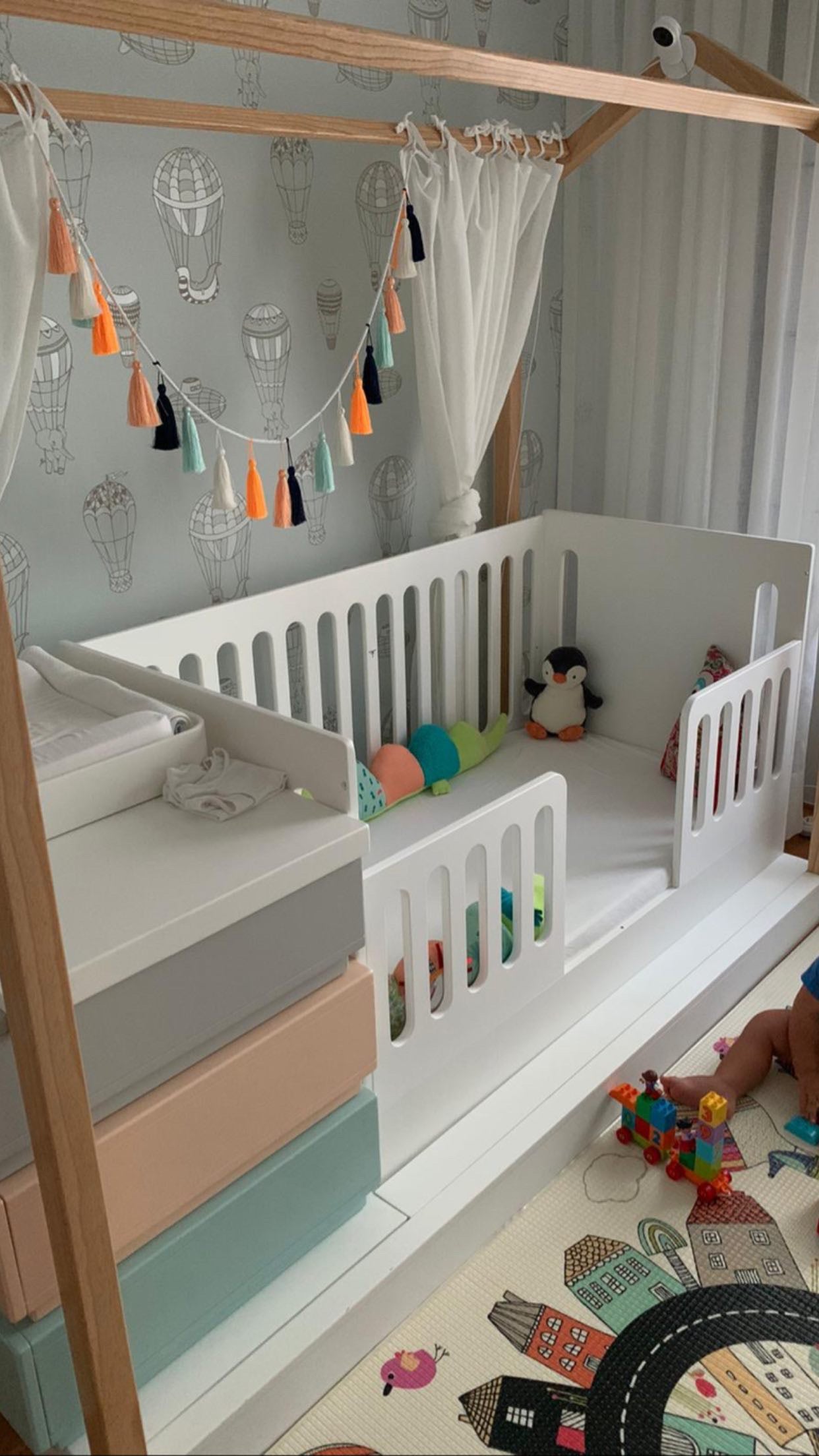 You can start with a floor mattress and then upgrade it with a drawer bed module underneath, and when your sibling is born, you can turn the same platform into a bunk bed with two beds with the bunk bed kit or a fun bed with an empty bottom and a play area that you can access with a ladder.
