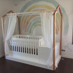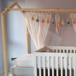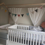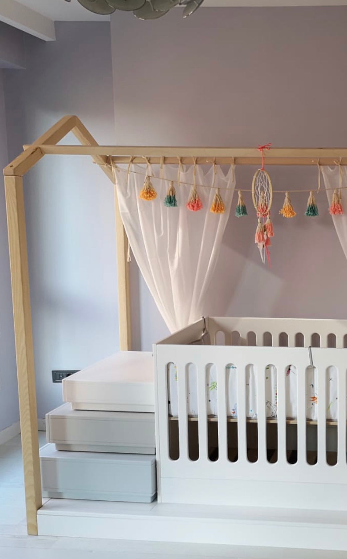 It is a floor bed designed with Montessori logic. With its house-shaped roofed design, it aims to reduce the space in children's rooms and make them feel safer.