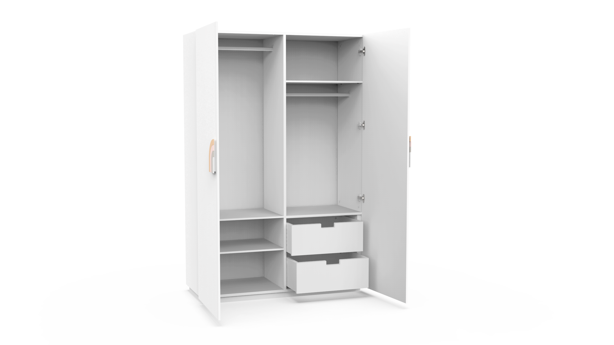 Lil'Gaea's baby room wardrobe series is eye-catching with its designs that prioritize aesthetics and functionality. Especially the 2-door baby room wardrobe model adds elegance to baby rooms with its different design options. This baby wardrobe offers a perfect solution for rooms with limited space. The 2-door baby wardrobe stores all baby clothes and accessories in an orderly manner thanks to its large interior volume and smart partition systems.